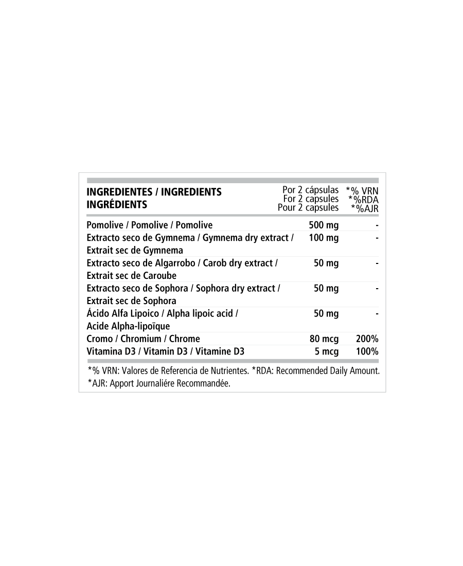 Ingredientes por 2 cápsulas: Pomolive (Extracto seco de Manzana (Malus domestica Borkh., frutos) y Extracto seco de Olivo (Olea europaea L., hojas)), Gelatina*, Agente de carga (Polidextrosa), Extracto seco de Gymnema (Gymnema sylvestr (Retz) R.Br, flores, 22% Ácido gymnémico), Extracto seco de Algarrobo (Ceratonia siliqua L., , cáscara del fruto, 95% D-Pinitol), Extracto seco de Sophora (Sophora japonica L., flores, 95% Quercetina), Ácido Alfa Lipoico, Antiaglomerantes (Sales magnésicas de ácidos grasos y Dióxido de silicio), Vitamina D3 (Colecalciferol, 100.000 UI/g), Picolinato de cromo y Colorantes (Óxido de hierro negro y Azul brillante FCF)*. *Componentes de la cápsula.